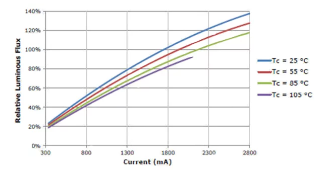 例如,在 TC = 25°C、IF = 1,300 mA 稳定状态下,相对光通量比值为 80%(如图表所示)。 如过 CXA3070 LED 在分档期间的测量值为 8,500 lm,则能在 TC = 25°C、IF = 1,300 mA 的稳定工作状态下输出 6,800 lm (8,500 * 0.8)。
