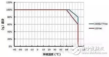 蓝色曲线则表示 LED 驱动器在输入 230Vac 或 277Vac 情况下,其负载随环境温度变化的功率降额曲线,其原理类同。