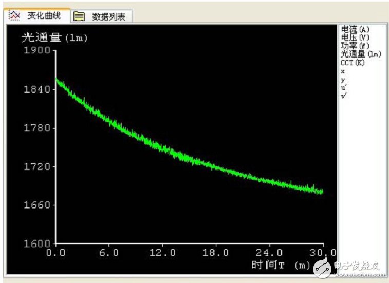 例如飞利浦公司的432195型球泡灯的输出流明,在半小时后,从1860lm降低至1680lm,降低至92%。具体流明下降过程如下图所示。