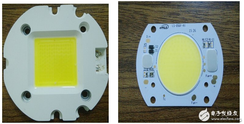 我们测试了一家深圳公司生产的60W无电解电容光引擎,以及埃菲莱公司生产的60W有电解电容光引擎。二者的外形照片如下: