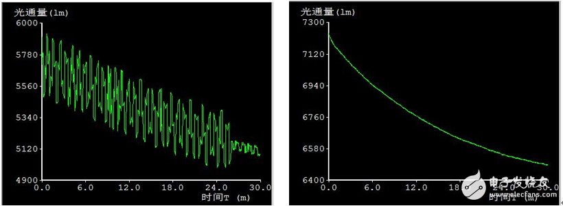在测试时采用了同样的散热器,以免由二者散热的不同而影响测试的结果。这两种光引擎的总光通量随时间的变化结果如下: