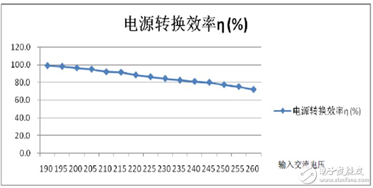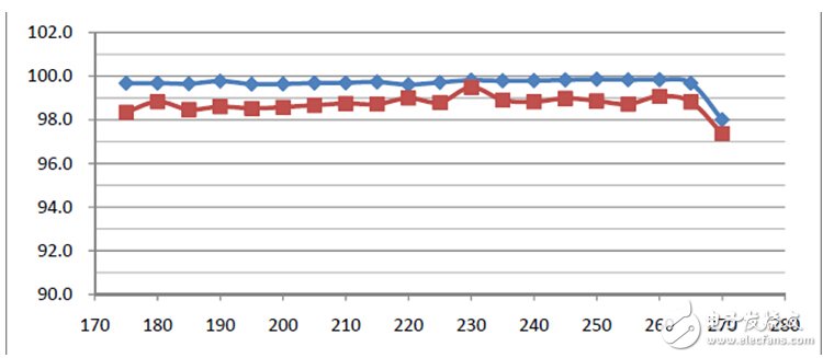 虽然我们只测了某一家公司、某一种产品的冷热光效的区别。可能有人会提出这是以点代面,不够全面的意见。假如从数据的准确程度来说的确是这样,然而如果用数据的大致结果来说,这些结果是有很大代表性的。其实道理很简单,造成冷热光效的区别的主要原因就是因为把低效率的恒流源集成到了和光源在一起的铝基板上,这样就造成了LED的结温比没有恒流源的结温要高,所以它的热光效就一定低。对于开关电源来说,它的效率是有可能达到95%的,可是由于开关电源元件多,体积大,是不可能集成到铝基板上去的。所以目前所有集成到铝基板上去的都只能是线性电源。当然线性电源的种类也有不少,现在用得最多的就是一种分段点亮的无电解电容光引擎,还有就是直接采用恒流二极管的有电解或无电解电容的光引擎,但是不管是哪一种线性电源,它的效率曲线都是完全一样的,都是随着市电电压的增加而直线降低,在220Vac时都是在85%左右(见下图)。