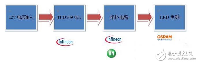本次的驱动方案采用驱动芯片TLD5097EL,是一款直流-直流脉冲宽度调节型的车灯控制方案,同时支持数字及仿真调光方式,通过外部连接电路实现升降压拓扑结构以对负载LED实现恒流控制;此外,TLD5097EL内部集成过温、过压和空载等情况的保护功能,并提供了状态输出接口以便对负载情况进行诊断。