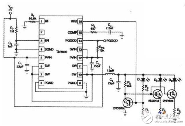 附图中使用的集成电路是TN1000,它是来自Tech,nor半导体公司的lOOmA电流模式步进降压直流/直流转换器。步进升压级包括了一只12μH 电感和一只22μF电容。D1的第一个LED通道驱动电流调节在17mA,它等于集成电路的 0.8V基准电压除以R1。C3上的电压被调节到需要支持D1和R4上电压以及R1上为0.8V的某个电压值。射极跟随器Q3驱动Q1和Q2的基极,镜像 D1的电流为17mA。射极跟随器Q1和Q2的VBE压降接近并补偿了Q3的VBE压降,因此R5和R6上的电压也是一个恒定的0.8V,而D2和D3由 一个恒定17mA驱动。R4设置为让C3上的电压足够高,使Ql和Q2不会饱和。R4值应设定为使C3上的电压可以支持最高LED电压与约255mV之 和,以他Q1和Q2远离饱和区。
