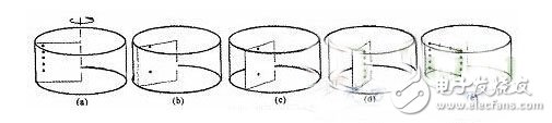 当发光二极管阵列屏在电机驱动下高速旋转,周期性地扫出一个柱体空间,阵列上的发光二极管旋转后提供分散于三维空间中的体显示介质,从而形成虚拟的体像素。为了便于理解,我们可对其进行空间分解,见图2所示。