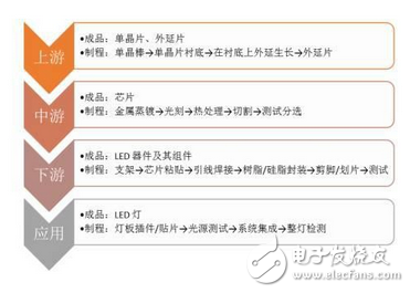 LED行业具有较长的产业链,包括上游外延片生长、中游芯片制造、下游芯片封装及应用领域,每一领域的技术特征和资本特征差异很大。具体产业链情况见下图: