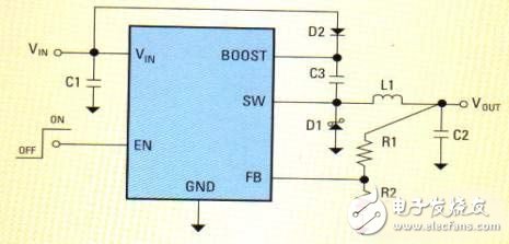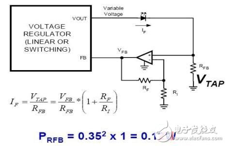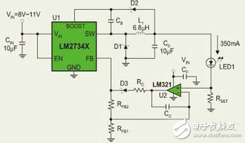 考虑运算放大器本身的功耗,RFB及其附属电路的功耗大约为1W LED功率的12%。这样就能在确保LED获得恒流供电的同时,将RFB的功耗降低到可以接受的水平,从而使LED两端的电压尽可能大,流经的电流也尽可能大。国家半导体按照这个原理工作的稳压器有LM2736和LM2734。