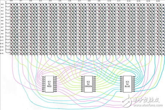 以下是采用 3 个 16 输出驱动器的普通 LED 布局与采用 1 个 48 输出驱动器的相同布局的比较。在每张图的上半部分有 256 (= 16 × 16) 个 RGB 3 合 1 LED 灯,相当于 768 个独立 LED 灯。使用 48 通道驱动器可显著简化设计,无需线路跨接。