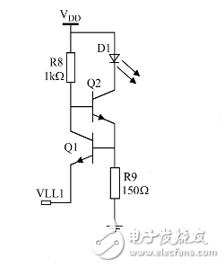 电路分析:背光驱动的要求是任何条件下背光LED的发光亮度不变,即需要构造一个恒流源电路。图所示的背光驱动电路是最简单的恒流源电路,电路工作时电阻R9两端电压等于VLL1加上BE极导通电压,是约为1.7V的固定电压,流过R9的电流也是固定电流,该电流约等于Q2的射极电流和集电极电流,所以流过背光二极管D1的电流也为一恒流,实现了背光LED的恒流驱动。背光LED的驱动电流为10mA左右,R9取值150Ω。