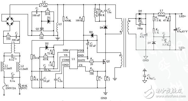 电路主要包括:无源泄放电路,有源阻尼电路,控制电路,单级反激变换电路。其中控制电路选用飞兆半导体的控制芯片FL7730。FL7730 是一款适合于单级反激拓扑的有源功率因数校正控制器,采用模拟检测方式,可兼容传统的TRIAC 调光,实现调光控制。本设计采用原边控制简化电路,降低成本,同时效率达到0. 8 以上。调光过程平稳且LED 灯无闪烁,较好地实现线性频率控制。