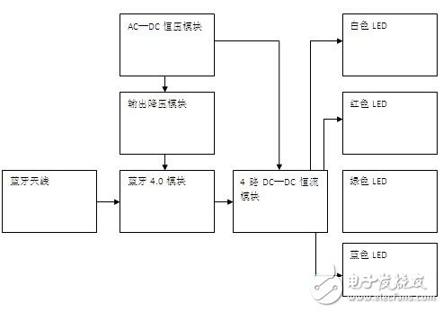 智能LED球泡灯蓝牙方案可分为四个模块:AC-DC恒压模块、DC-DC恒流模块(其路数由调色效果来决定) 、LED变色模块及蓝牙控制模块。