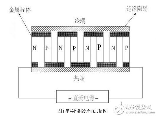半导体制冷又称电子制冷,或者温差电制冷,是从50年代发展起来的一门介于制冷技术和半导体技术边缘的学科,与压缩式制冷和吸收式制冷并称为世界三大制冷方式。半导体制冷器的基本器件是热电偶对,即把一只N型半导体和一只P型半导体连接成热电偶(如图1),通上直流电后,在接口处就会产生温差和热量的转移。在电路上串联起若干对半导体热电偶对,而传热方面是并联的,这样就构成了一个常见的制冷热电堆。借助于热交换器等各种传热手段,是热电堆的热端不断散热并且保持一定的温度,而把热电堆的冷端放到工作环境中去吸热降温,这就是半导体制冷的原理。