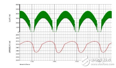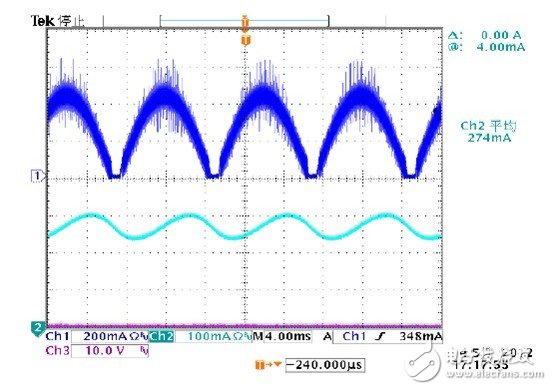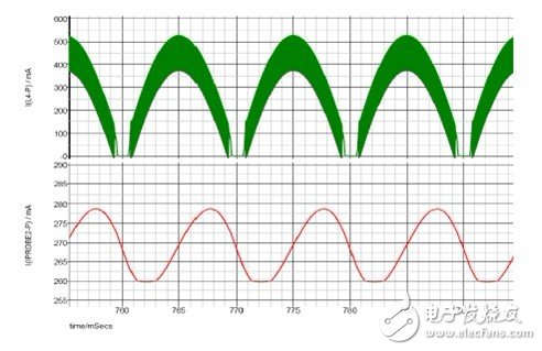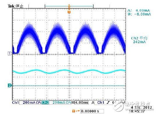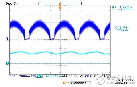 测量和仿真得电流波形(参见图4和图5)几乎完全一样;输出纹波表明存在一些小的差异,原因是LED仿真模型和实际测试LED负载之间有差异。