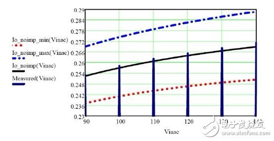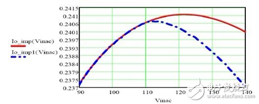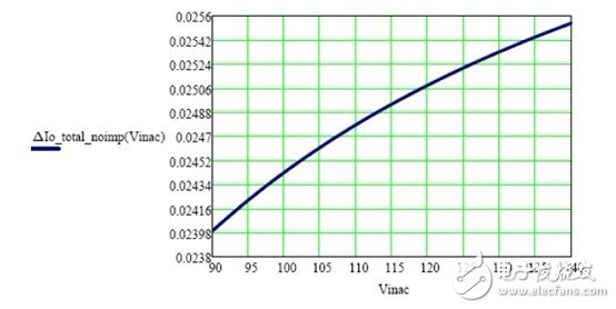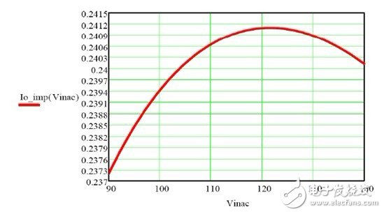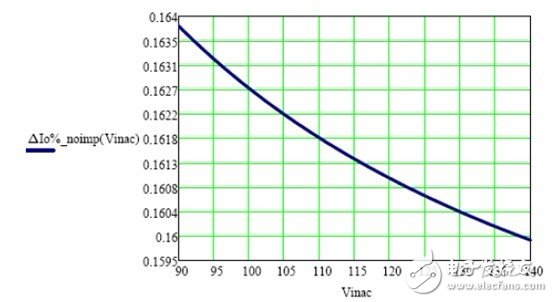 从公式(24),我们可以看到,90Vac到140Vac以上的正常LED电流变化为17mA,线性稳压为± 3.3%,这对单个组件而言是可以接受的。但是,实际工程的主要问题是总调节可行性,也即考虑组件容限情况下的总LED电流容限。由图8,我们知道,受组件容限影响的输出电流变化约为32mA。因此,批量生产时的总LED电流容限为± 8%以上,如图10所示。在实际生产过程中,这同样很难实现。从上述分析我们可以知道,线性稳压是改善输入范围总容限的关键。