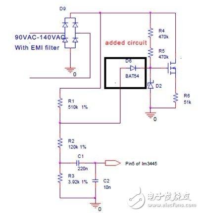 如图1所示,C1大于C2,目的是实现更高的PF值,例如:C1/C2 = 220n/10n。LM3444或者LM3445的针脚5的电压可以表示为: