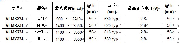 VLMx234.。器件的半强角为±60°,每个包装单位的发光强度比小于1.6,并按照每个包装单位的发光强度和颜色进行了分类。LED采用8mm卷带包装,可采用红外回流焊工艺,根据JEDEC Level 2a进行了预处理,可承受2kV的ESD电压,达到JESD22-A114-B的要求。器件符合RoHS,无卤素,符合Vishay绿色标准。