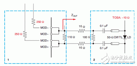 低功耗设计时,它拥有一个500?差动后端接。由于LR DFB TOSA仅有10?阻抗(近似值),因此如果没有添加传输电路反射情况更糟糕。传输电路的作用是驱动负载阻抗从驱动器端靠近50?。