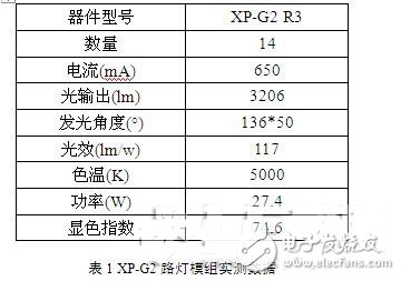 通过和散热、光学等6个配套件组合,我们制作了包括LED器件、铝基板、散热器、光学透镜、防水等配套件的路灯模组,其实测稳态数据如下: