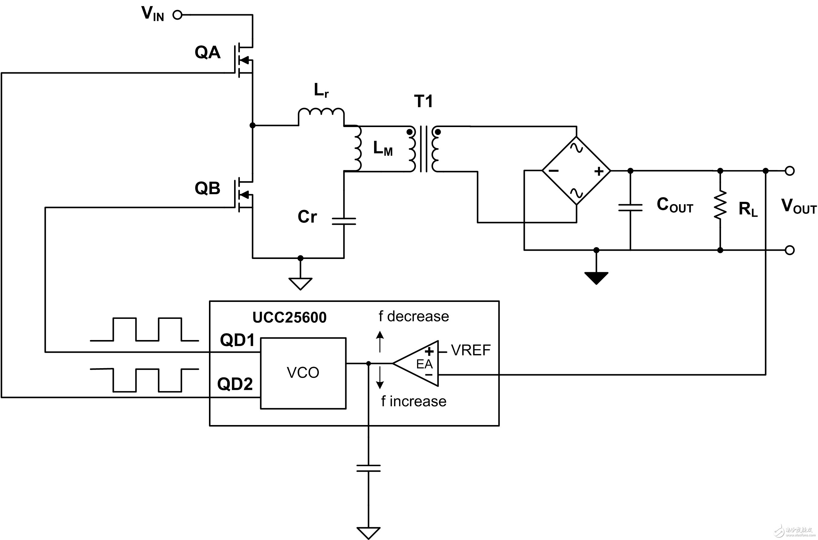LLC谐振半桥控制器dc/dc(请参见图 1)是一种脉冲频率调制(PFM)控制拓扑。半桥FET(QA和QB)异相驱动180,并利用一个电压控制振荡器(VCO)调节/控制频率。这反过来又能调节谐振电感(Lr)形成的分压器阻抗、变压器磁电感(LM)、反射等效阻抗(RE)和谐振电容器(Cr)进行调节。仅有LM中形成的电压通过变压器匝数比(a1)反射至次级线圈。