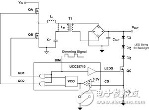 对于要求亮度调节的 LLC 谐振半桥 LED 驱动器而言,简化设计过程的一种方法是使用一种被称为 PWM 亮度调节的技术。图 3 显示了一个 LLC 转换器的功能原理图,它的 LLC 控制器便使用了这种 PWM 亮度调节技术。在我们的例子中,我们使用了 UCC25710。