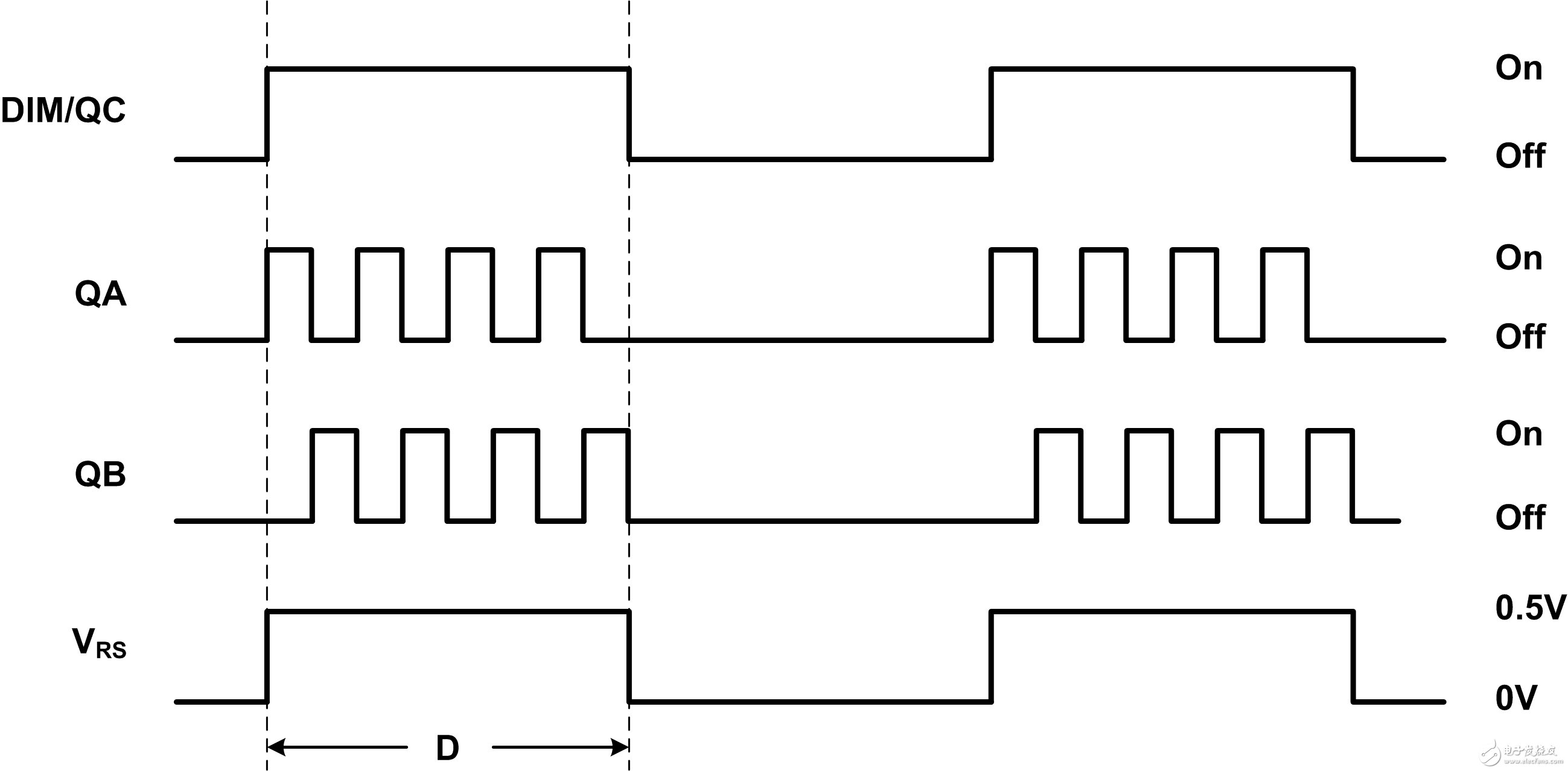 这种技术利用一个控制 FET QC 的固定低频信号 (DIM),它以逻辑方式添加至QA 和 QB FET 驱动。DIM 信号为高电平时,LED 背光灯串被控制在某个固定峰值电流 (VRS/RS)。一旦 DIM 变为低电平,QA、QB 和 QC 立即关闭。QA、QB 和 QC 关闭后,LED 二极管便停止导电,同时输出电容器 (COUT)存储能量,以备准时开始下一个 DIM 周期。更多详情,请参见图 4 所示波形。