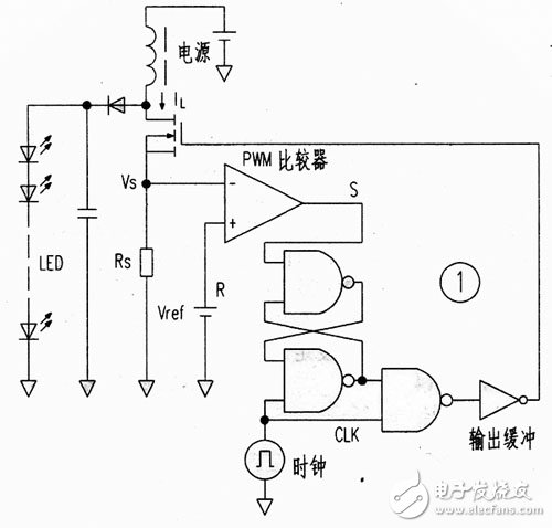 图1是这种驱动电路的方框图,它省略了传统电路的三角波发生器和误差放大器,而使用了CM0S逻辑IC和PWM调制器。当时钟CLK信号为低电平时,RS触发器处于复位状态,输出FET关断。而当CLK信号为高电平时,输出FET导通。其电流被电阻Rs转换成电压,当此电压高于基准电压Vref 时,比较器输出由高变低,RS触发器又被复位,输出FET再关断。其结果,即使电源电压有变化,储存在电感中的能量却是恒定的。实现了恒功率输出。这里是把Rs上的电压降作为三角波电压,PWM比较器将此电压与基准电压直接比较而起到了误差放大器的作用。