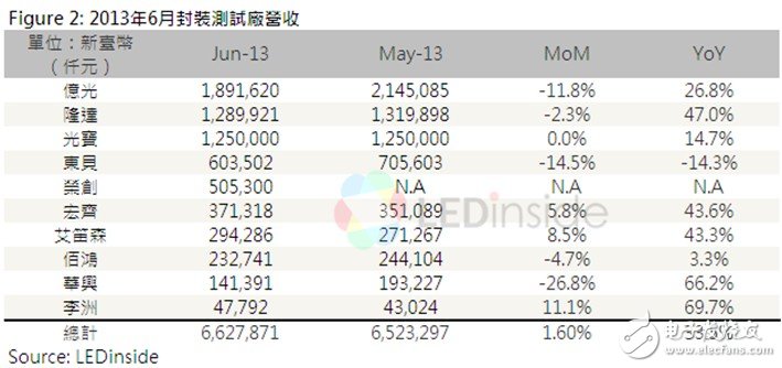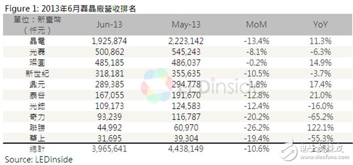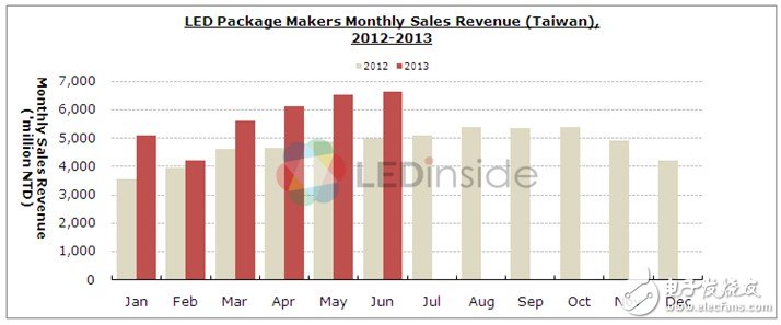 根据全球市场研究机构TrendForce旗下绿能事业处LEDinside表示,LED市场需求受到背光市场需求减缓,以及库存盘点影响,2013年6月***上市上柜LED厂商营收总额下滑至106亿元,其中***上市柜LED晶片厂商营收达新台币39.7亿元,***上市柜LED封装厂商营收成长也达到新台币66.3亿元。