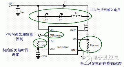 图2是NCL30161的典型应用降压LED驱动器的框图。可以看到,LED直接连接到输入电压,电流通过连接到地端的RSENSE设置;PWM调光和使能控制通过芯片的DIM/Enable脚实现;ROT用来设置初始关断时间。
