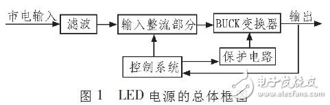 采用BUCK变换器、IPD控制实现开关电源,输出恒定的电流和电压,驱动LED灯。电路的总体框图如图1所示。