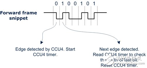 DALI通讯是由控制装置透过前向讯框(Forward Frame)所起始(Initiated),此框架由十九个位元组成,包含关于被定址控制装置与DALI命令的重要资讯,这些位元必须由控制装置利用曼彻斯特(Manchester)编码技术进行解码(图2)。关于向前讯框的侦测,XMC1000系列32位元微控制器使用其多功能的撷取/比对单元 (Capture Compare Unit 4, CCU4),此单元可设定为侦测讯号上升缘及下降缘,并透过撷取计时器撷取从最后一次侦测的讯号边缘到目标讯号所经过的时间长度,此提供更便利且稳定的方式,以检查接收到资料的有效性。