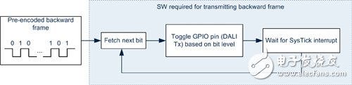 在第一种技术中,GPIO脚位设定为输出脚位,此脚位也是DALI传输脚位。此脚位依据即将传送的向后讯框进行切换,SysTick提供时间基础或延迟GPIO的切换,以确保已传送的讯号可满足所要求的期间。