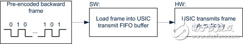 在第二种技术中,向后讯框中预先编码的位元将载入至USIC传输先进先出(FIFO)缓衝区。后续的传输程序将由硬体自动处理,无需任何中断程式服务。