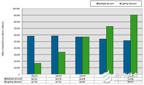 图2 2012∼2016年LED背光与照明应用对LED的需求量分析 资料来源:NPD DisplaySearch(07/2013)
