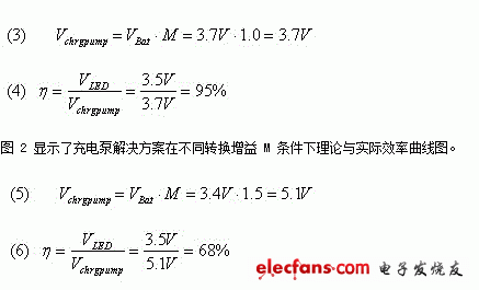 式中 Vchrgpump 为充电泵 IC 内部产生的电压,VBat 为锂离子电池的典型电池电压。充电泵需要提供一个恒定的电流以及相当于 LED 3.5V 典型正向电压的输出电压。通常,固定转换增益为 2 的充电泵会在内部产生一个更高的电压 (1),从而引起内部压降,并降低整体系统效率 (2)。更为高级的充电泵解决方案通过在 1.5 和 1 转换增益之间进行转换克服了这一缺点。这样就可以在电池电压稍微高于 LED 电压时实现在 90%~95% 效率级别之间运行,从而充许使用增益值为 1 的转换增益。方程式 (3) 和方程式 (4) 显示了这一性能改进: