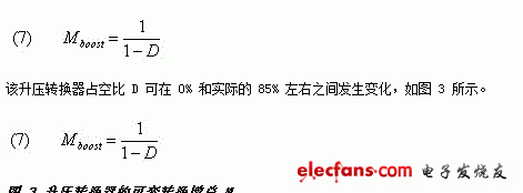 通过使用一款感应升压转换器可以克服这些不足之处,该升压转换器具有一个可变转换增益 M,如方程式 (7) 和图 3 所示。