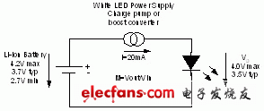 该锂离子 (Li-Ion) 电池具有一个介于 2.7V~4.2V 的电压范围。该电源的主要任务是为白光 LED 提供一个恒定的电流和一个典型的 3.5V 正向电压。