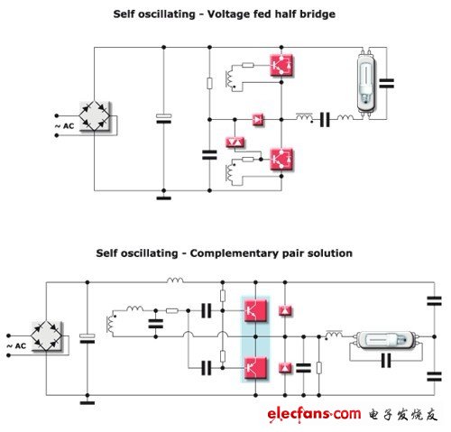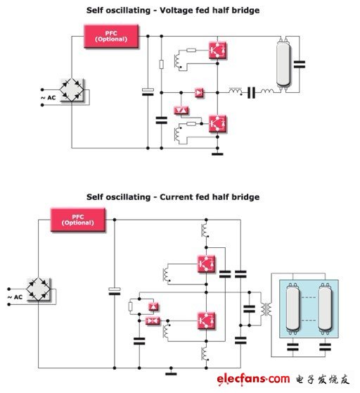 由于简单、成本低,小型荧光灯电子驱动电路普遍采用自振荡电压反馈拓扑结构。 启动后,DC-AC 转换器通过双极型晶体管基极经变压器构成的反馈回路保持振荡。 新型互补对解决方案基于较高增益双极型功率管,荧光灯镇流器设计人员采用这种解决方案,可以消除饱和铁芯辅助变压器以及启动网络。 这一解决方案基于半桥电压反馈拓扑结构,采用荧光灯串联电感上的辅助绕组工作,生成共振驱动电路波形。 标准自振荡和互补对解决方案对开关频率具有很高的耐受性,不必控制荧光灯功率。 设计小型智能驱动电路唯一的办法,是采用带有高压功能和内置振荡器的专用 IC。 根据应用要求,还可以配置预热和调光功能。