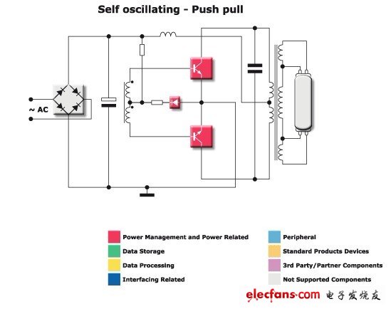 由于具有更高效的灯光控制功能并提高功率系数,自振荡推挽式荧光灯镇流器正在广泛取代传统磁镇流器。 ST 优化的双极型功率管有效采用自振荡推挽式拓扑结构。 以下方框图可用于选择最适用的产品和器件设计高频镇流器电路。