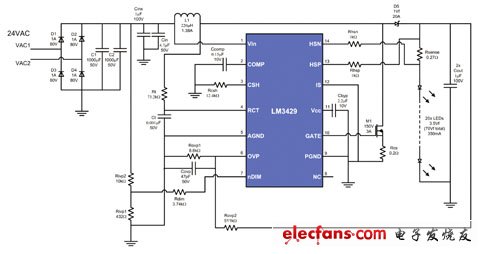 图1 大型阵列设计应用LM3429的升压配置,採用24VAC系统,在电流为350毫安培的条件下,可驱动二十个LED。