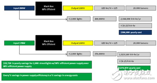 举例来说,假设某座城市计划更换两千盏路灯,在比较两种型号时,效率达到10%的差异(图2)。值得注意的是,高效率系统的系统输入电源为178瓦(W),而低效率系统需要200瓦才能达到相同的160瓦照明输出。相当于年度能源成本节省10%,光就电源供应的能源效率计算,等于节省33,726美元,这笔节省的成本远高于LED系统所节省的成本。