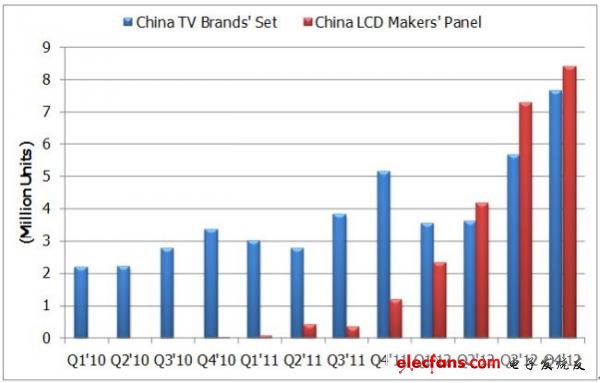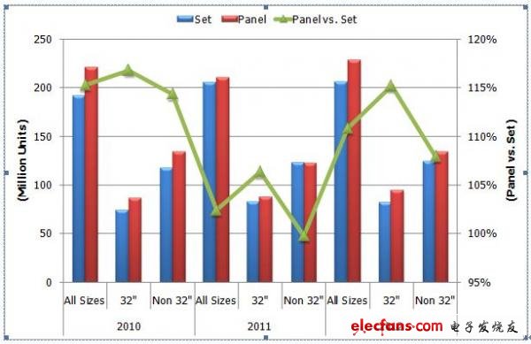 我们预测2012年液晶电视出货量将达到2亿6百万台,仅比去年上升0.4%。2012年面板出货提高,而整机出货则呈现有限的增长,这显示品牌商的整机和面板库存都逐渐呈现过剩,特别是接近年底的库存。