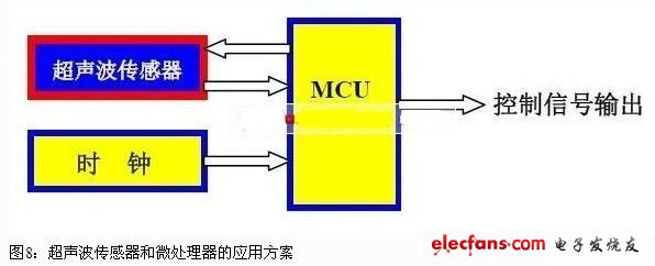与红外传感器应用相仿的超声波传感器近年在自动探测移动物体中得到更多的应用。超声波传感器主要利用多普勒原理,通过晶振向外发射超过人体能感知的高频超声波,一般典型的选用25~40kHz波,然后控制模块检测反射回来波的频率,如果区域内有物体运动,反射波频率就会有轻微的波动,即多普勒效应,以此来判断照明区域的物体移动,从而达到控制开关的目的。图8是超声波传感器和微处理器组合的应用方案。