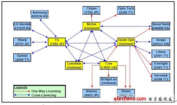 据了解,专利战争对LED大厂而言是一种商业竞争的手段与策略,目前全球LED关键专利技术被飞利浦(Philips)、欧司朗(Osram)、日亚化学(Nichia)、丰田合成(ToyodaGosei)、Cree这5大厂用交叉授权牢牢掌控。目前虽然LED照明的技术应用和推广条件日趋成熟,但绝大多数企业手中没有LED核心专利和技术。这是当前国内企业进军LED产业面临的最大问题。