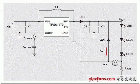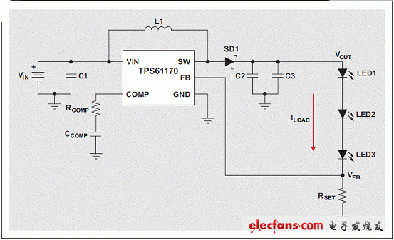 作为一个应用举例,TI TPS61170 升压转换器 IC 被配置为一个恒定电流 LED驱动器。在诸如背光照明或者手电筒等应用中,它是驱动高亮度LED串的理想升压转换器。3V-18V 输入范围允许使用较宽的电源范围,例如:2S 到 4S 锂离子或者 3S 到 12S 碱性电池组、USB 或者 12V 电源轨。
