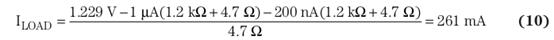 利用选择的负载电流和保护电阻器,计算与预期负载电流的偏差(参见下列方程式 10)。数据表值200 nA用于反馈偏置电流 (IFB),1 µA 值则用于预计的齐纳二极管漏电流,VOUT 约为 10V。