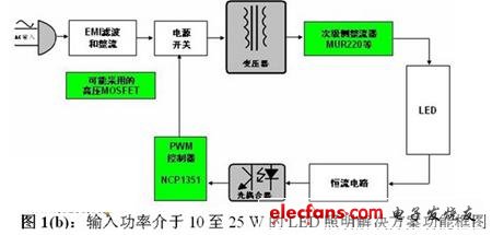 图2显示的是安森美半导体NCP1351离线式LED驱动器参考设计。这参考设计的输入功率范围介于85至265 Vac之间,具有尺寸小、成本低、良好线路稳压等特性,在20 W负载具有80%的高能效,并集成了过载保护和短路保护等安全特性,最大尺寸仅为125×37×35 mm。