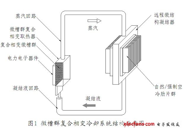 在毛细微槽群复合相变取热器内表面加工许多微槽道,形成微槽群结构,利用微细尺度复合相变强化换热机理,实现在狭小空间内,对小体积的高热流密度及大功率的器件的高效率地取热。毛细微槽群复合相变取热器取出的热量由蒸汽经蒸汽回路输运到远程的高效微结构凝结器中,在微结构冷凝器内微细尺度凝结槽群结构表面上进行高强度微尺度蒸汽凝结放热。冷凝器凝结所释放的热量可迅捷地扩散到微细尺度凝结槽群结构表面,并经壁面向外传导到微结构冷凝器的外壁的肋表面上,通过与外界环境进行对流换热将热量释放到环境中去。凝结液通过凝结液体回路,在压力梯度作用流回到微槽群复合相变取热器。从而实现系统自身取热与放热的高效率、无功耗的封闭循环,达到器件冷却的目的。微槽群复合相变取热器的取热面与电力电子器件紧密接触,其内表面刻有许多复合相变微槽道,集成为复合相变微槽群。微槽群复合相变取热器中有少量的具有一定汽化潜热的液体工质。液体工质在微槽群自身结构所形成的毛细压力梯度的作用下沿微槽流动,同时在微槽中形成扩展弯月面薄液膜蒸发和厚液膜核态沸腾的高强度微细尺度复合相变强化换热过程,使液体工质变成蒸汽,利用汽化潜热带走电力电子器件工作时产生的巨大热量,从而将器件的工作温度降低并控制在理想的范围内。微槽群复合相变冷却系统由小尺寸取热元件(微槽群复合相变取热器)、热量及流体输运管路、远程放热元件(远程微结构凝结器)部分构成。其中,热量及流体输运管路包括输运热量的蒸汽回路和输运凝结液的凝结液回路两部分,分别将微槽群复合相变取热器和远程微结构凝结器连接起来,形成一个对外封闭的微负压循环系统。微槽群复合相变取热器取出的巨大热量由蒸汽在系统的蒸发与凝结压差作用下经蒸汽回路输运到远程微结构凝结器中,在微结构凝结器内腔中的微细尺度凝结槽群结构表面上进行高强度微尺度蒸汽凝结放热。蒸汽凝结所释放的热量由微细尺度凝结槽群结构表面经壁面向外传导到微结构凝结器外壁的肋表面上或外壁上的冷却水通道群中(注:微结构凝结器壁面将外界环境和冷却水与微结构凝结器内部隔开,外界环境和冷却水与微结构凝结器中的凝结液不接触),通过与外界环境进行的空气(自然或强制)对流换热或与冷却水通道群中的冷却水进行单相强制对流换热,最终散失到外界环境中。而凝结液则通过凝结液回路,借助于重力和系统微细尺度槽群结构所产生的压力梯度作用,流回到微槽群复合相变取热器中。从而整个系统按照由微槽群复合相变取热器、蒸汽回路、远程微结构凝结器、凝结液回路再回到微槽群复合相变取热器的顺序形成一个具有工质单向性流动的、液-汽-液相变取热和放热模式的无功耗循环(被动式循环),达到使发热的大功率电力电子器件冷却的目的。图1 为冷却系统示意图。