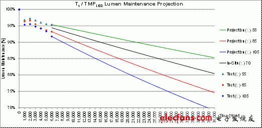 ★ 使用Exponential公式计算出各时间之流明维持率,则可以计算出之数据绘出各测试温度的推估寿命曲线图: