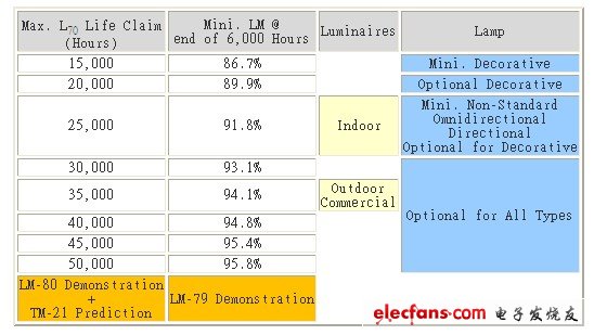 ENERGY STAR在灯具只有两种规格,灯具厂商可使用整灯点亮6,000Hrs.,或提交组件厂商的6,000Hrs LM-80报告与TM-21推估结果来证实灯具成品的流明维持率,在灯泡部分标准就较为弹性,用途不同则标准会进行微调,如下表: