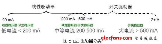 如今在市场上典型的LED驱动器包括两类,即线性驱动器和开关驱动器;大概的适用范围见图2.如电流大于500mA的大电流应用采用开关稳压器,因为线性驱动器限于自身结构原因,无法提供这样大的电流;而在电流低于200mA的低电流应用中,通常采用线性稳压器或分离稳压器;而在200至500mA的中等电流应用中,既可以采用线性稳压器,也可以采用开关稳压器。